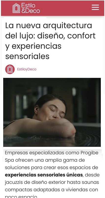 En Progibe Spa diseñamos y desarrollamos soluciones de bienestar que transforman los espacios en auténticos lugares de desconexión, salud y disfrute. Nuestra especialización en spas, jacuzzis, swim spas, saunas y zonas wellness a medida, tanto para uso residencial como profesional, ha despertado el interés de medios especializados en bienestar, arquitectura, diseño, lifestyle y lujo, que han querido poner el foco en nuestra manera de entender el bienestar a través del agua y la experiencia sensorial.